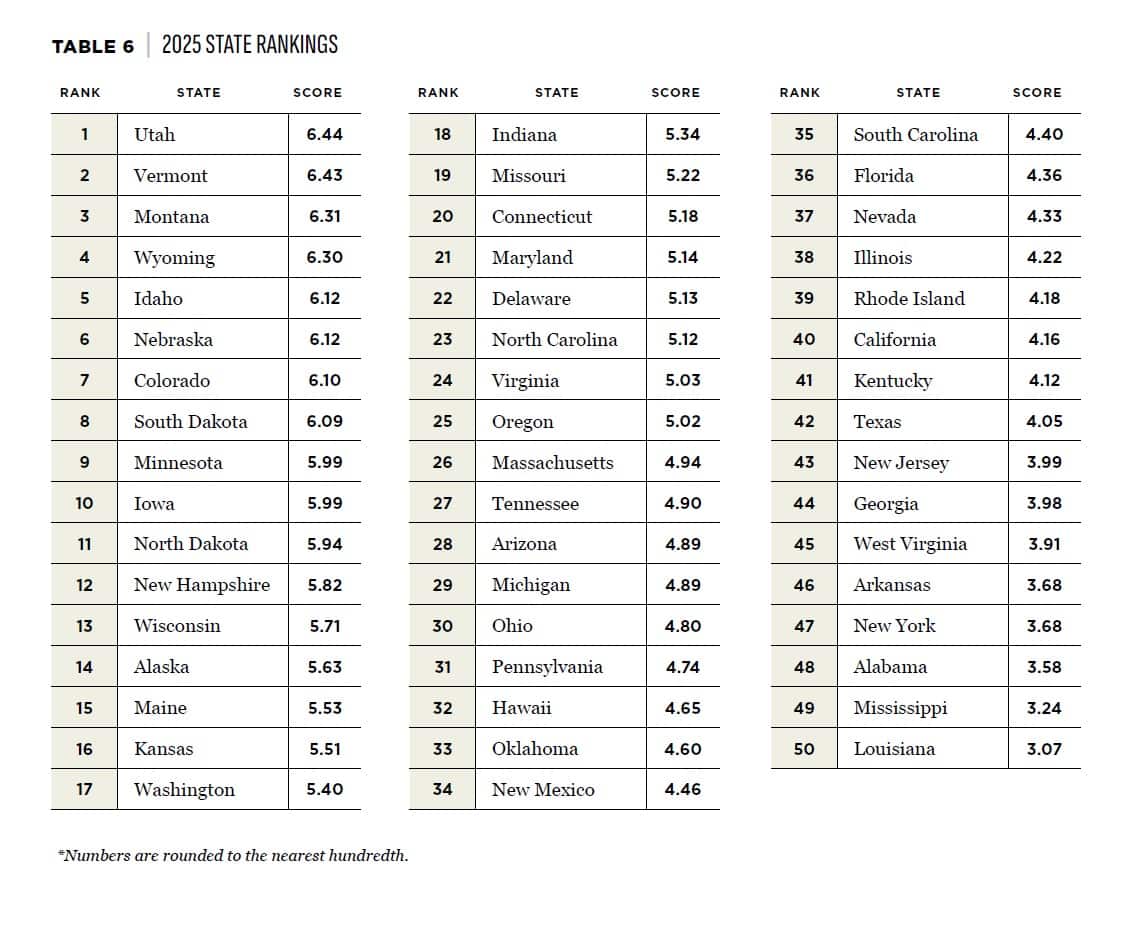 The first edition of this index was released in 2023. For the 2025 edition, we added measures for median home prices, energy and electricity costs, and childcare regulations.